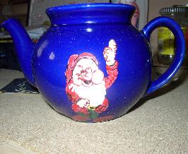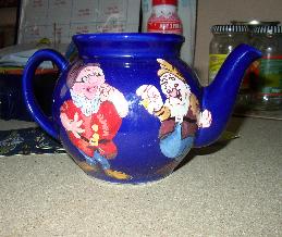 On the tea pot the bottom fell out while i was painting it, well it had been in the back garden for a number of years as a flower pot.